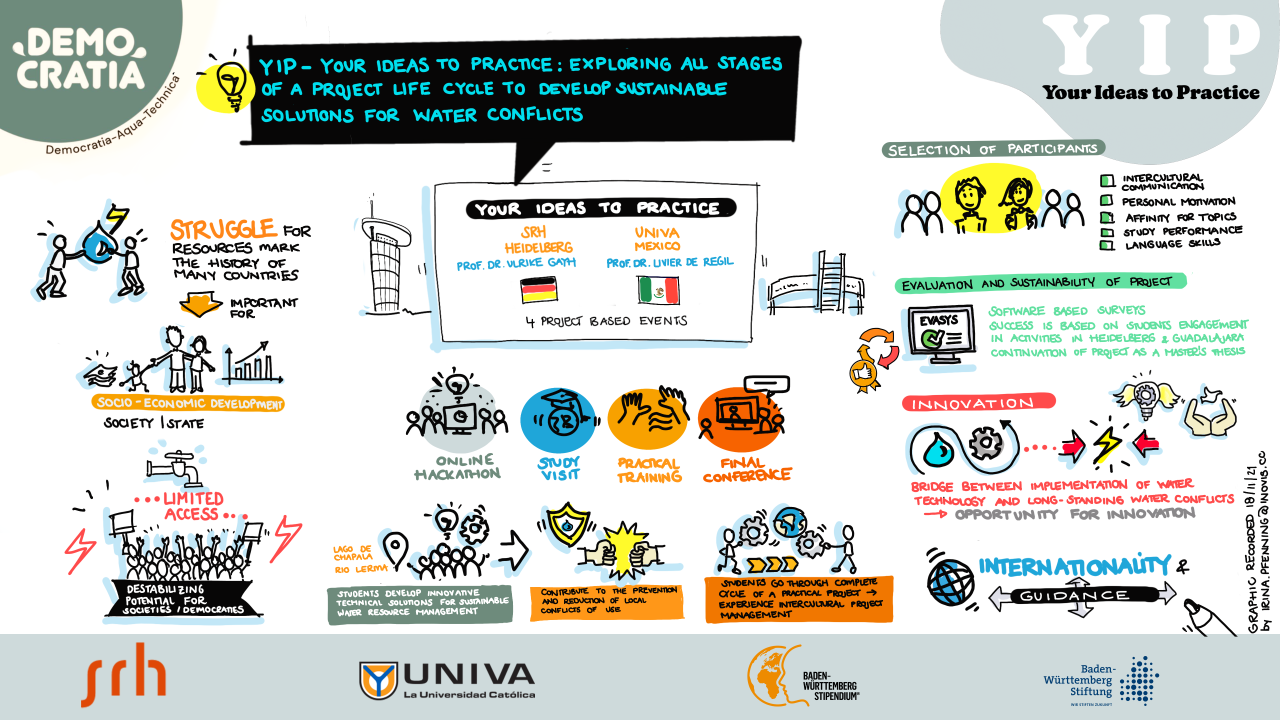 To promote Research and Development regarding Water Conflicts among young students, Prof. Dr. Ulrike Gayh (SRH University Heidelberg) came up with an initiative called Democratia-Aqua-Technica, funded by the DAAD (Deutschen Akademischen Austauschdienst). The Universidad del Valle de Atemajac (UNIVA) from Mexico has also joined this initiative under the management and direction of Prof. Dr. Livier De Regil, Head of the study program Humanitarian Engineering and the Research Department of the UNIVA.
